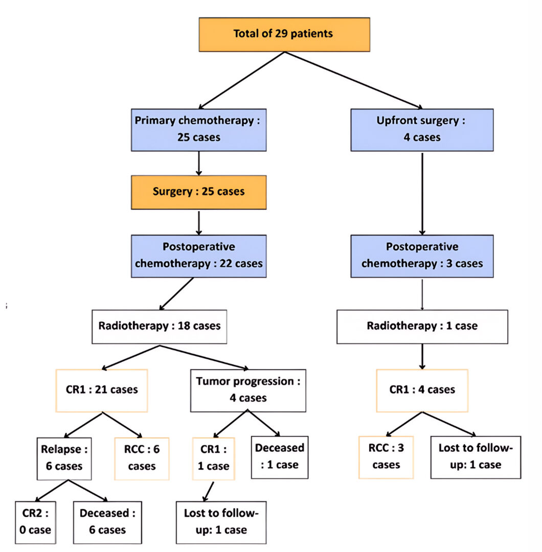 Therapeutic management included preoperative chemotherapy in 25 patients, resulting in tumor reduction in 18 patients (72%), complete resolution of pulmonary metastases in 4 patients, and partial reduction in 3 patients. Surgery consisted of extended total uretero-nephrectomy in 26 patients and partial nephrectomy in 3 patients. Four patients underwent immediate surgery: two due to compressive symptoms requiring urgent intervention, and two others for cystic lesions not warranting preoperative chemotherapy. Three of the four operated patients received postoperative chemotherapy.