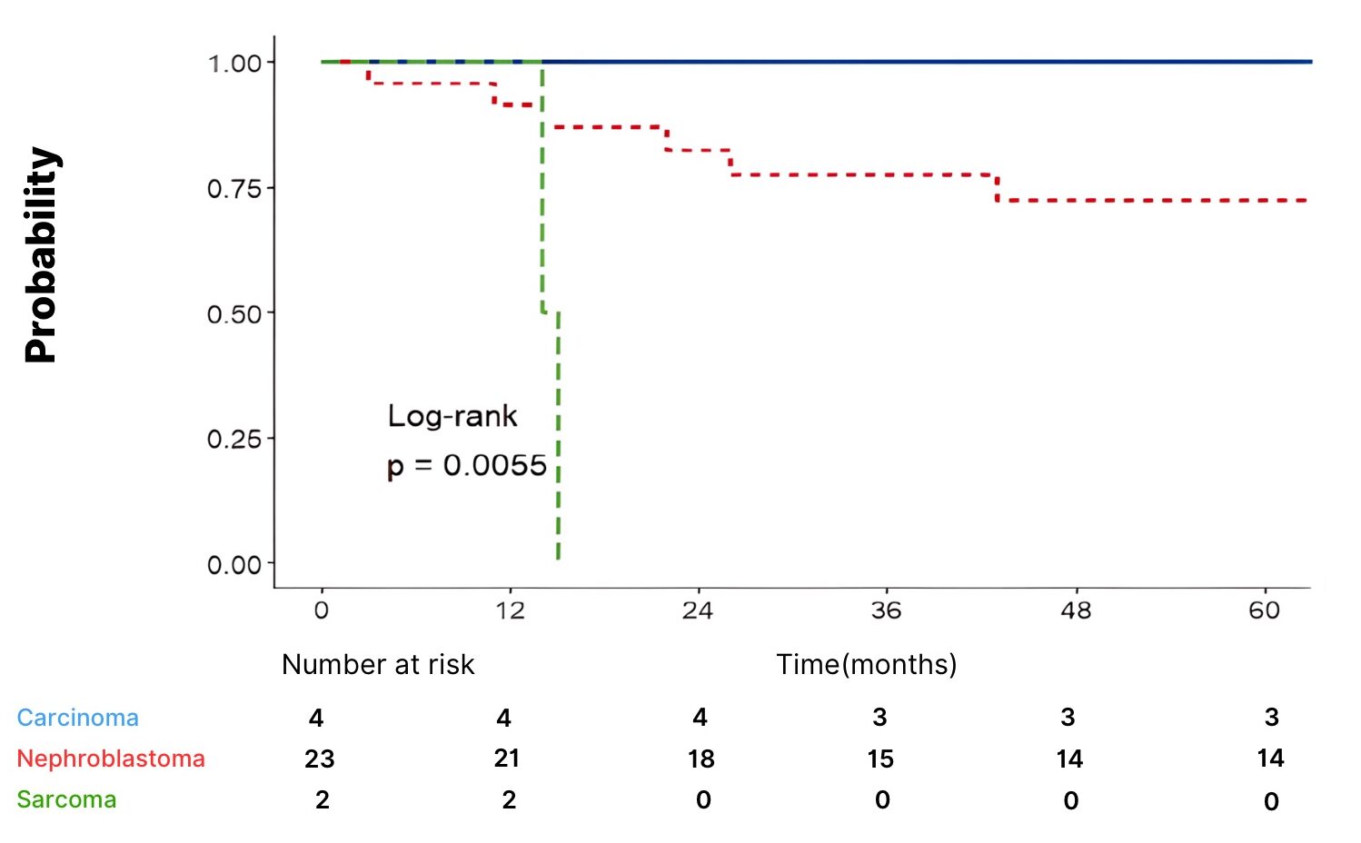 Survival by histological type revealed a 100% 5-year survival for clear cell carcinoma cases, and for nephroblastoma cases: 93.1% at 1 year, 87% at 3 years, and 77.5% at 5 years. (Figure 1)