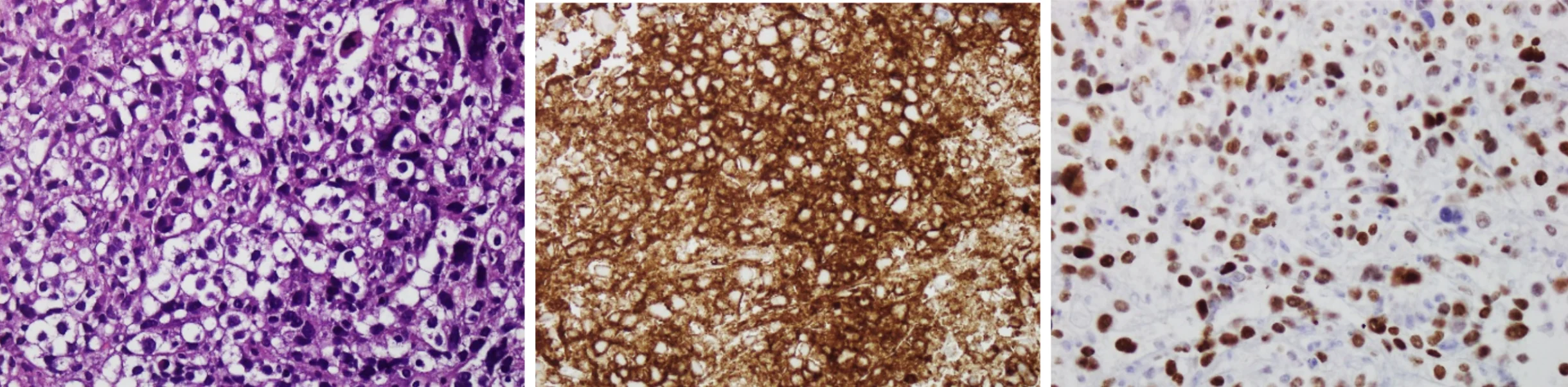 Figure 3:Core Biopsy of the patient with Diffuse Large B-cell Lymphoma. Histopathological findings of the hepatic core biopsy demonstrating diffuse infiltration by large atypical lymphoid cells consistent with diffuse large B-cell lymphoma (DLBCL). Immunohistochemical staining showed strong positivity for CD20, CD79a, PAX5, BCL-2, BCL-6, MUM-1, and C-MYC, confirming B-cell lineage, while CD30 staining was negative, excluding T-cell lymphoma.