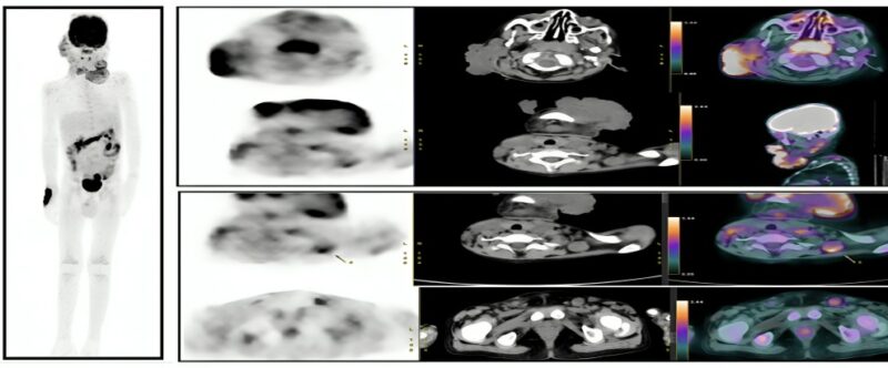 Figure 2: Multiple metabolically active facial soft tissue lesions with metabolically active lymph nodes