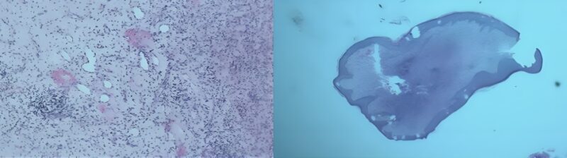 The primary result of the histological examination of the excised lesion suggested a chronic inflammatory process, raising suspicion for atypical mycobacterial infection (AMI) alongside deep fungal infection (Figure 3). Further special staining with PAS, GMS, ZN, and Gram’s stains is recommended to identify the nature of the causative organism.